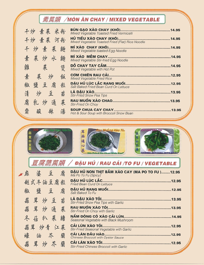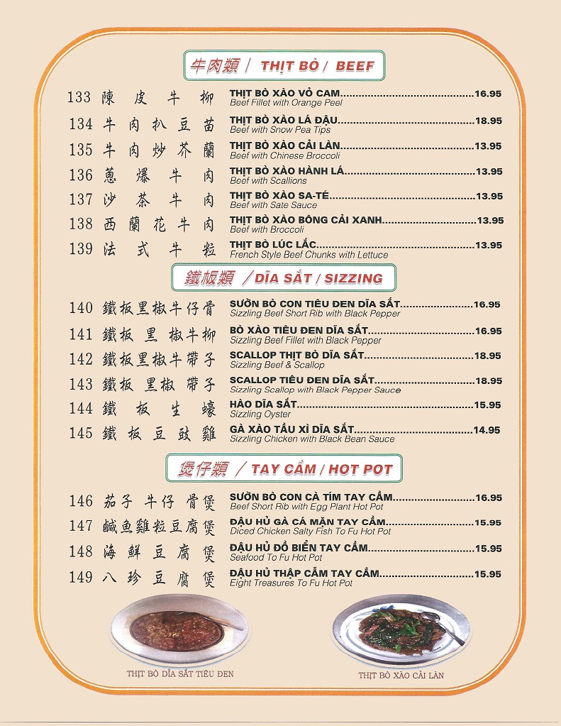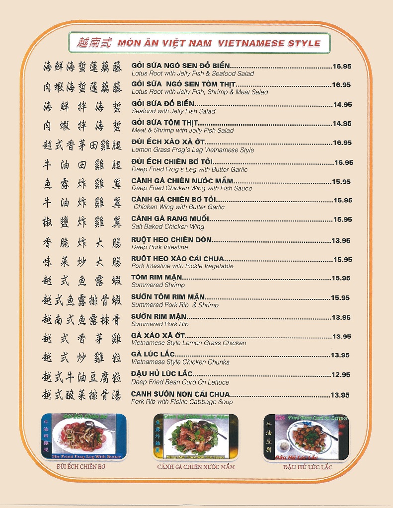 A Ly Oriental Restaurant Menu